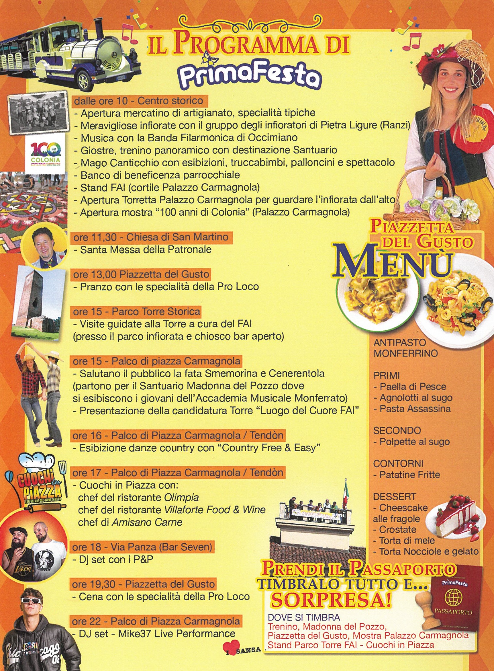 A SAN SALVATORE MONFERRATO sabato e domenica si terrà la festa patronale PrimaFesta con bancarelle, giostre, intrattenimenti musicali ; per maggiori informazioni clicca qui Sempre sabato alle 11,00 verrà inaugurata la mostra fotografica "i 100 anni della Colonia e il suo fondatore Giuseppe Barco. Per maggiori informazioni clicca qui