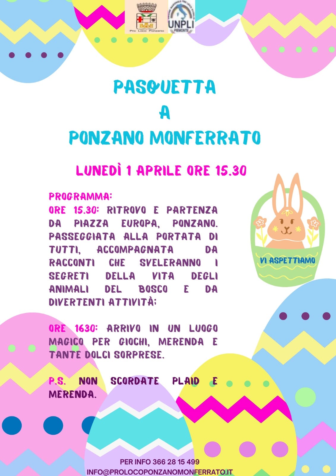 A PONZANO MONFERRATO lunedì alle 15,30 si terrà "Pasquetta a Ponzano Monferrato" con passeggiata e giochi per bambini. (Ritrovo in piazza Europa). Per maggiori informazioni e prenotazione clicca qui