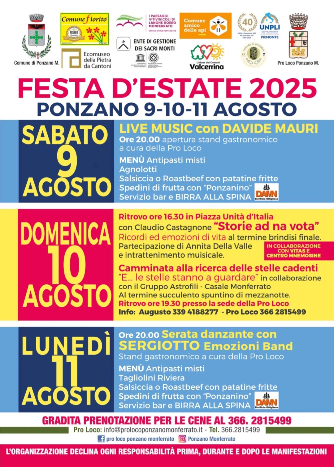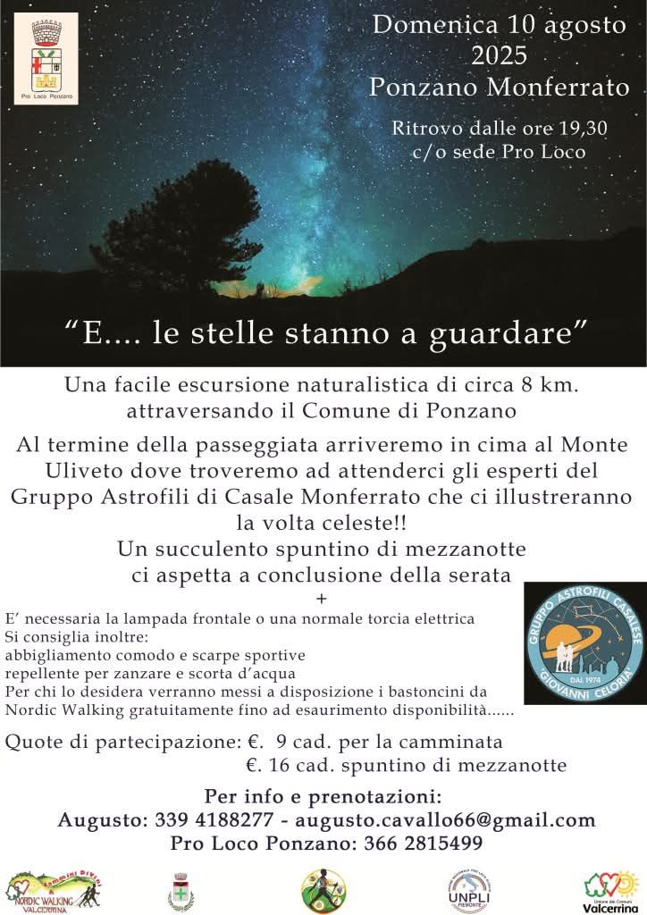 A PONZANO MONFERRATO da sabato a lunedì la festa d'Estate con eventi musicali, gastronomici e culturali ; per maggiori informazioni e prenotazioni clicca qui . Per gli amanti dell'outdoor domenica si terrà la camminata "E le stelle stanno guardare" ; per maggiori informazioni e prenotazioni clicca qui