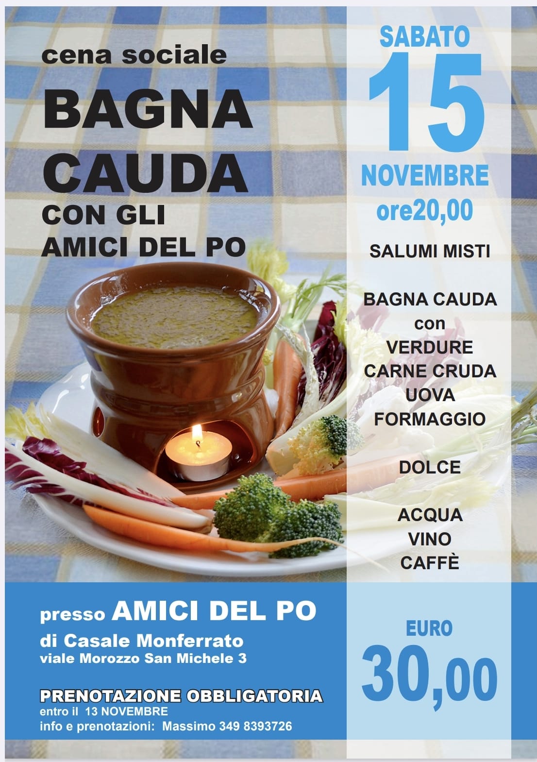 - Presso la sede sociale degli Amici del Po ( viale Morozzo San Michele, 3) si terrà la cena sociale "Bagna Cauda con gli amici del Po" ; solo su prenotazione anticipata (sabato). Per maggiori informazioni clicca qui