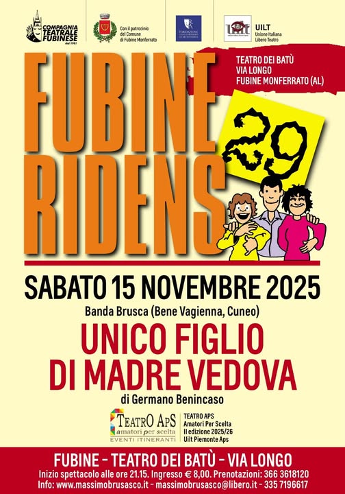 - A FUBINE MONFERRATO presso il teatro dei Batù prosegue la rassegna "Fubine Ridens" con lo spettacolo "Unico figlio di madre vedova" ( sabato); per maggiori informazioni clicca qui