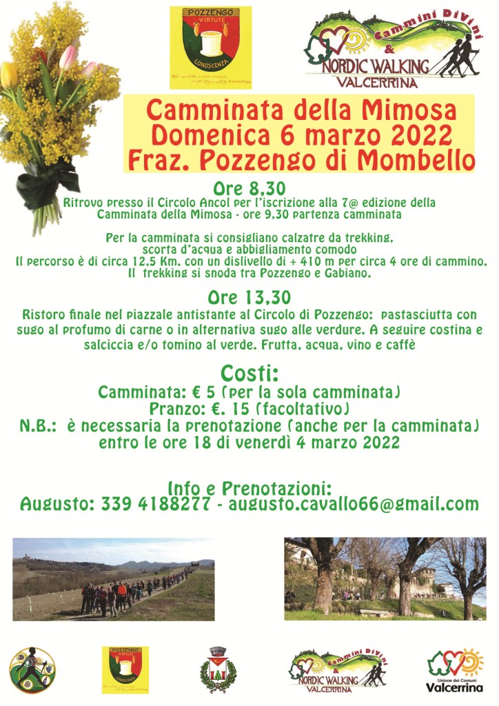 A MOMBELLO MONFERRATO domenica, in occasione della Festa della Donna, si terrà la “Camminata della Mimosa”. Il percorso è di circa 12,5 km con un dislivello di +410 m per circa 4 ore di cammino, il trekking si snoda tra Pozzengo e Gabiano; su prenotazione e pagamento (ritrovo previsto alle ore 8,30) Per maggiori informazioni clicca qui.
