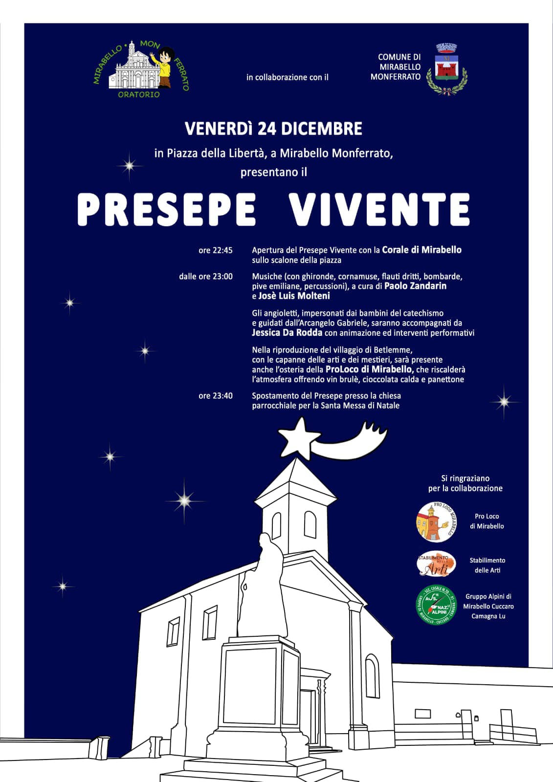 A MIRABELLO MONFERRATO venerdì 24 si terrà dalle 22.45 il Presepe Vivente in piazza della Libertà; per maggiori informazioni potete cliccare qui.