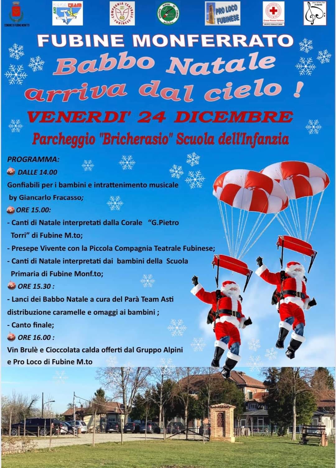 A FUBINE MONFERRATO venerdì 24 dal pomeriggio tantissimi eventi per bambini con “Babbo Natale arriva dal cielo”: giochi, intrattenimenti musicali, presepe vivente con la compagnia Teatrale Fubinese e lanci dei Babbo Natale a cura del Parà Team Asti; per il programma completo clicca qui.