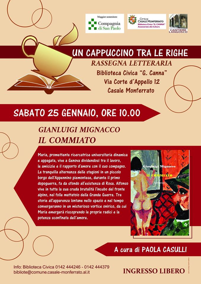 Per la rassegna “Un cappuccino tra le righe” presso la Biblioteca Civica Giovanni Canna sabato alle ore 10,00 protagonista sarà Gianluigi Mignacco, che parlerà del suo libro Il commiato. Per maggiori informazioni clicca qui