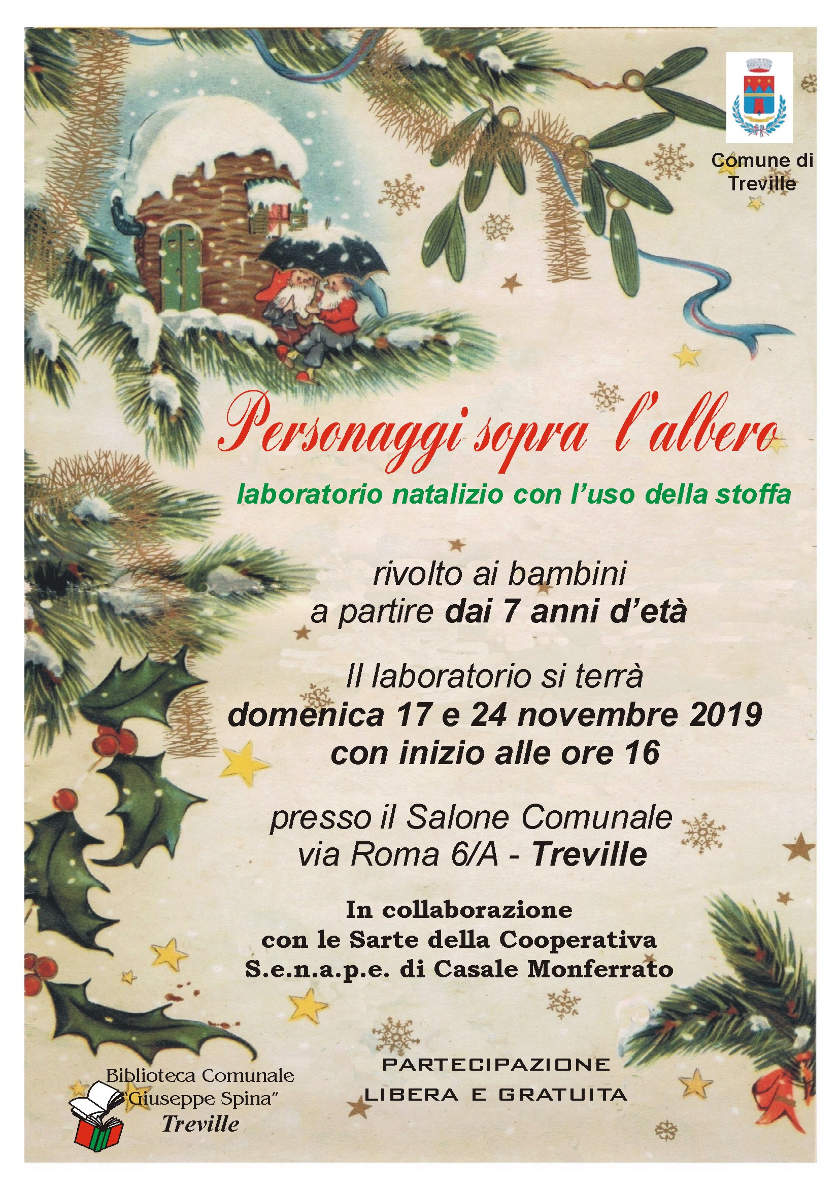 A TREVILLE domenica alle ore 16 presso il Salone Comunale di Casa Devasini la Biblioteca Comunale G. Spina è in programma “Personaggi sopra l’albero”, laboratori natalizi con l’uso della stoffa per bambini a partire dai 7 anni. Per maggiori informazioni potete cliccare qui