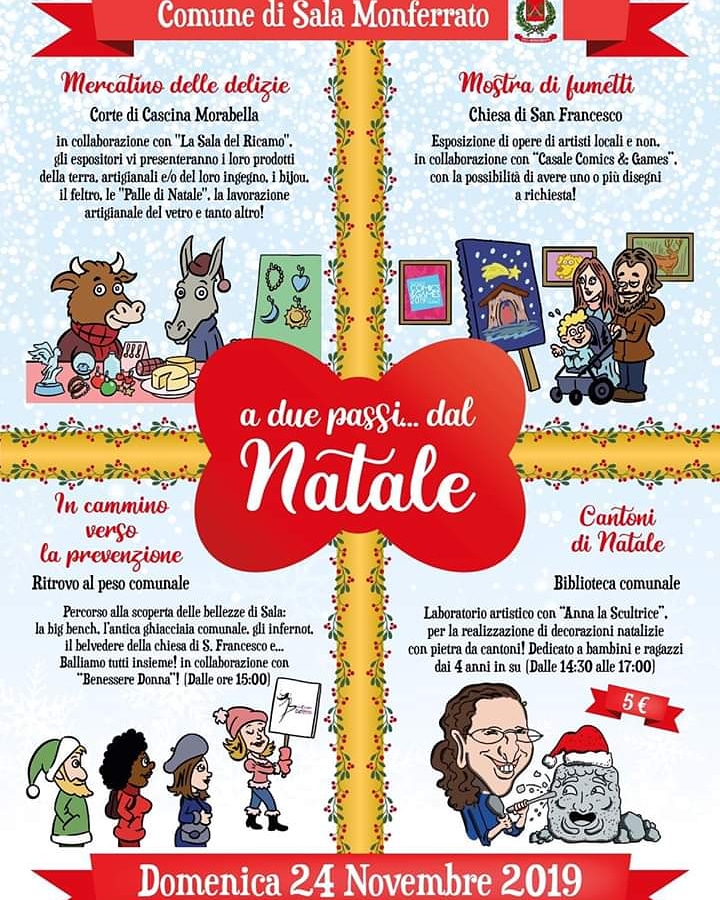 A SALA MONFERRATO appuntamento natalizio domenica con “A due passi dal Natale”, una giornata ricca di eventi dalle 10 alle 18: "Mercatino delle Delizie" presso l'antica Corte di Cascina Morabella; possibilità di visitare l'Antica ghiacciaia e l'Infernot; “Mostra di Fumetti” presso la Chiesa di S. Francesco (in collaborazione con "Casale Comix & Games); laboratorio per bambini dedicato alla Pietra da Cantoni (14,30-17); percorso alle scoperte di Sala e dei benefici del "movimento" sul nostro corpo (dalle 15). Per maggiori informazioni potete cliccare qui.