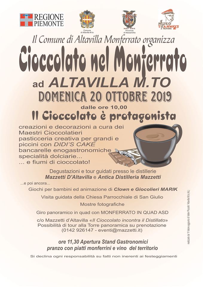Ad ALTAVILLA MONFERRATO domenica si tiene “Cioccolato in Monferrato”, a partire dalle ore 10,00 con degustazioni, creazioni, bancarelle enogastronomiche e specialità dolciarie. Per maggiori informazioni potete cliccare qui.
