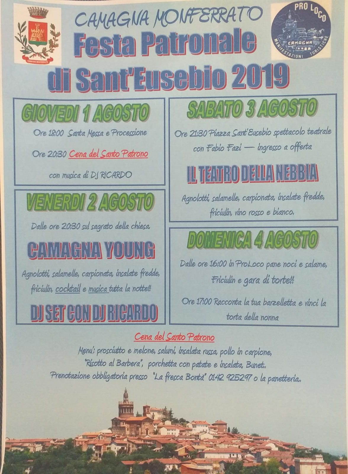 A CAMAGNA MONFERRATO si tiene la Festa Patronale di Sant'Eusebio, con appuntamenti gastronomici ed intrattenimenti; per maggiori informazioni potete cliccare qui.