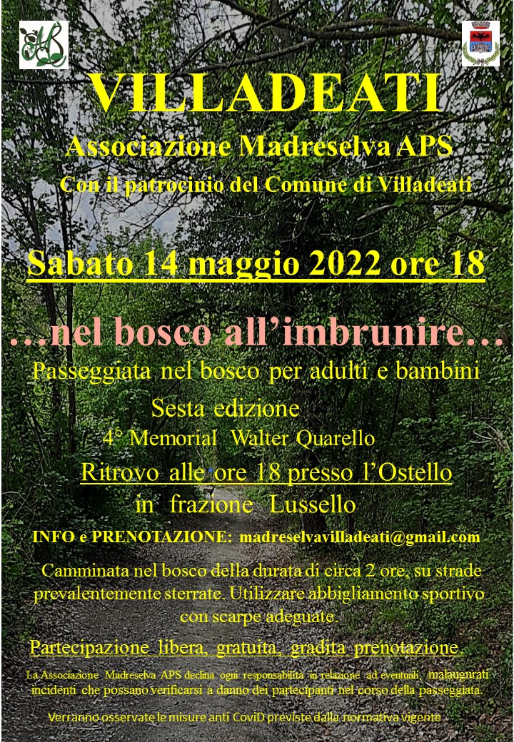 A VILLADEATI sabato alle ore 18,00 si terrà la passeggiata nel bosco all'imbrunire ( ritrovo presso l'Ostello in frazione Lussello) Gradita la prenotazione, per maggiori informazioni clicca qui