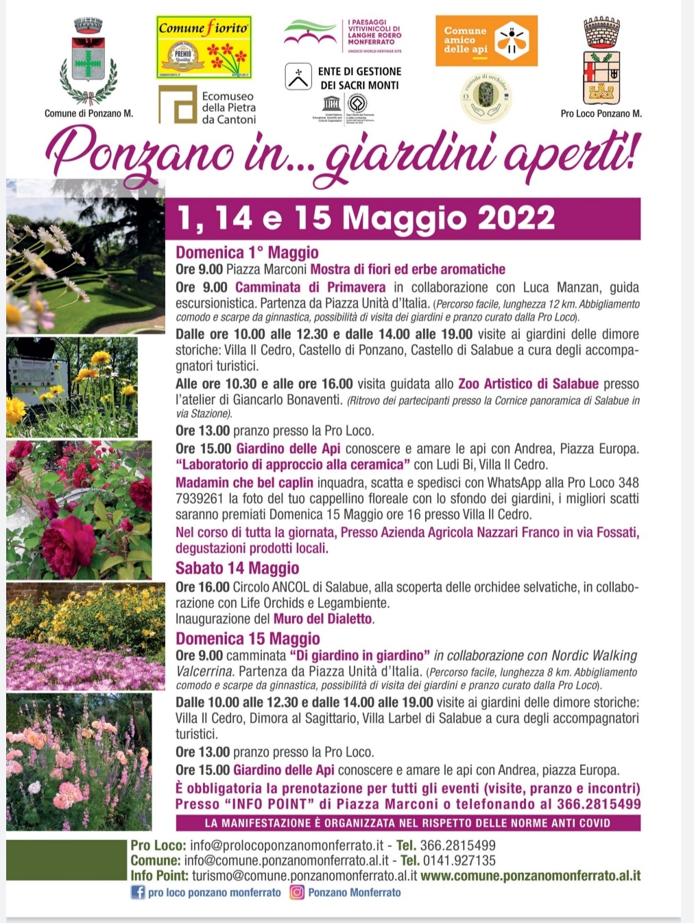 A PONZANO MONFERRATO nell’ambito della rassegna “Ponzano ….in giardini Aperti” sabato alle ore 16 presso il Circolo Ancol di Salabue si terrà l’evento alla scoperta delle orchidee selvatiche, in collaborazione con Life Orchids e Legambiente (per maggiori informazioni potete cliccare qui). Domenica alle ore 9,00 si terrà la camminata “Di giardino in giardino” (su prenotazione, per maggiori informazioni clicca qui). A seguire apertura dalle 10,00 alle 12,30 e dalle 14,00 alle 19,00 di Villa il Cedro, il Castello di Ponzano e Castello di Salabue; alle ore 15,00 si terrà l'evento “Giardino delle Api - conoscere e amare le api” in Piazza Europa. Prenotazione obbligatoria, per visite, incontri e pranzi. Per maggiori informazioni clicca qui.