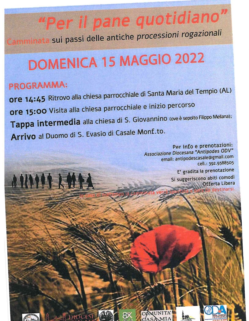 Domenica nell'ambito di “Panis et Vinum - Settimana per il Patrimonio Culturale Ecclesiastico della Diocesi di Casale Monferrato” alle ore 14.45 si terrà la camminata di circa 6km “Per il pane quotidiano”, sui passi delle antiche processioni rogazionali (ritrovo presso la chiesa parrocchiale di Santa Maria del Tempio, gradita la prenotazione; in caso di maltempo la camminata sarà rinviata a data da definirsi). Per maggiori informazioni clicca qui.