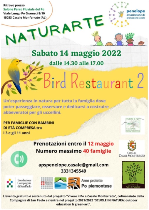 Sabato alle ore 14,30, presso l'Ente di Gestione delle Aree Protette del Po piemontese di Casale Monferrato si terrà l'evento “Naturarte Bird Restaurant 2”: l'APS Penolope in collaborazione con Semi di Senape e l'Ente di Gestione delle Aree Protette del Po Piemontese propone un'esperienza in natura per tutta la famiglia dove poter passeggiare, osservare e dedicarsi a costruire abbeveratoi per gli uccellini. L'evento è gratuito dedicato ai bambini a famiglie con i bambini tra i 3 e gli 11 anni, prenotazione obbligatoria entro il 12 maggio, per maggiori informazioni clicca qui.
