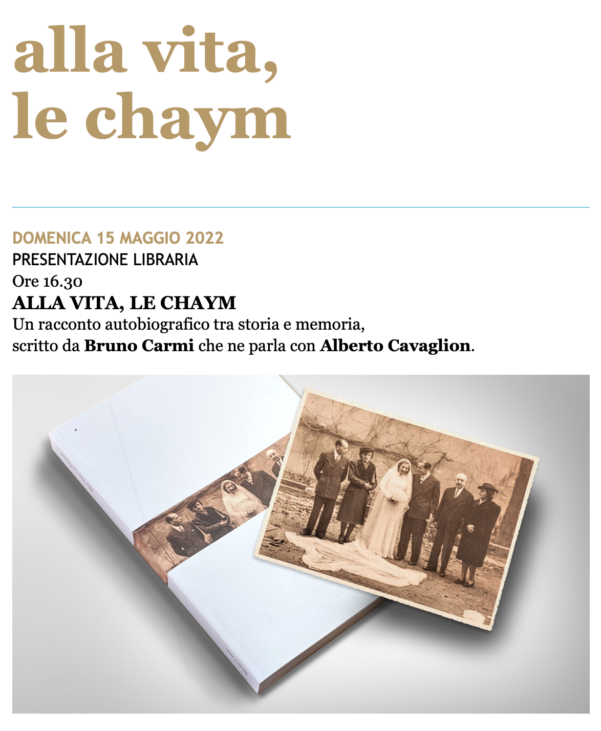 Presso la Sinagoga domenica alle 16,30 si terrà la presentazione libraria “Alla vita, le Chaym”, racconto autobiografico tra storia e memoria scritto da Bruno Carmi che ne parla con Alberto Cavaglion. Per maggiori informazioni clicca qui.