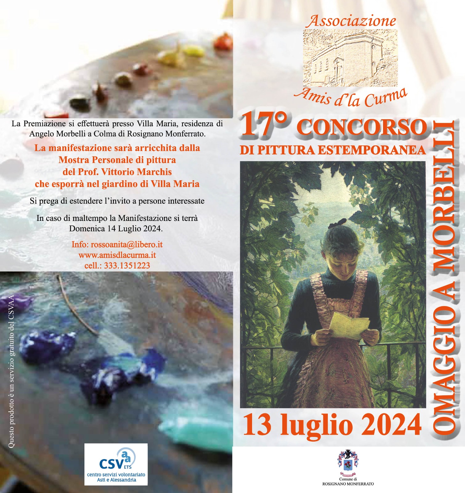 A ROSIGNANO MONFERRATO sabato torna il Concorso di Pittura Estermporanea "Omaggio a Morbelli", il cui scopo è quello di rivisitare i luoghi e valorizzare il paesaggio tanto caro al Pittore Divisionista Angelo Morbelli . Inoltre la manifestazione è arricchita dalla Mostra Personale di pittura del Prof. Vittorio Marchis, allestita presso il Giardino storico di Villa Maria, dimora estiva del pittore. Per maggiori informazioni e regolamento clicca qui