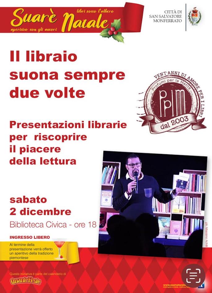 A SAN SALVATORE MONFERRATO sabato alle ore 18 presso la Biblioteca si terrà la presentazione libraria "Il libraio suona due volte" di Davide Ruffinengo. Per maggiori informazioni clicca qui.