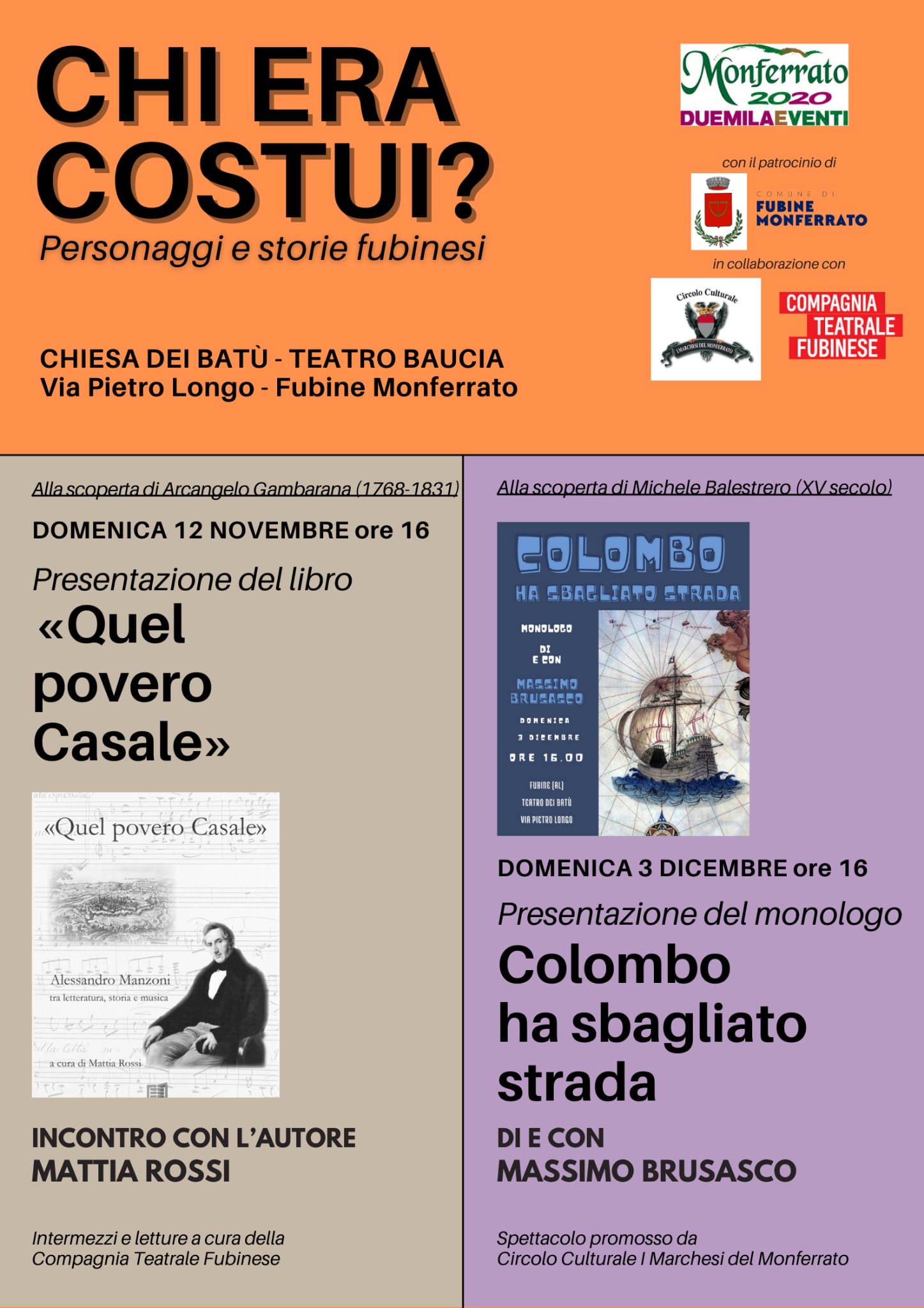 A FUBINE MONFERRATO domenica alle 16 nell'ambito della rassegna "Chi era costui" si terrà la presentazione del monologo "Colombo ha sbagliato strada" di e con Massimo Brusasco. Per maggiori infromazioni clicca qui