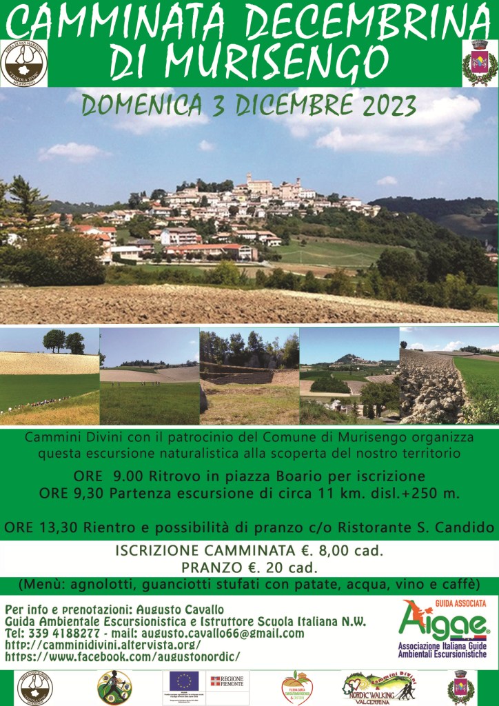 A MURISENGO domenica alle 9,00 si terrà la "Camminata Decembrina" ( ritrovo alle ore 9,00) . Per maggiori informazioni e sulle modalità di prenotazione clicca qui Nel weekend, prosegue la Stagione del Tartufo Bianco nel Monferrato, con l’Angolo del Trifolau, il Temporary Store TargatoMurisengo & Dintorni con prodotti km0 (in orario 10,00-17,00).