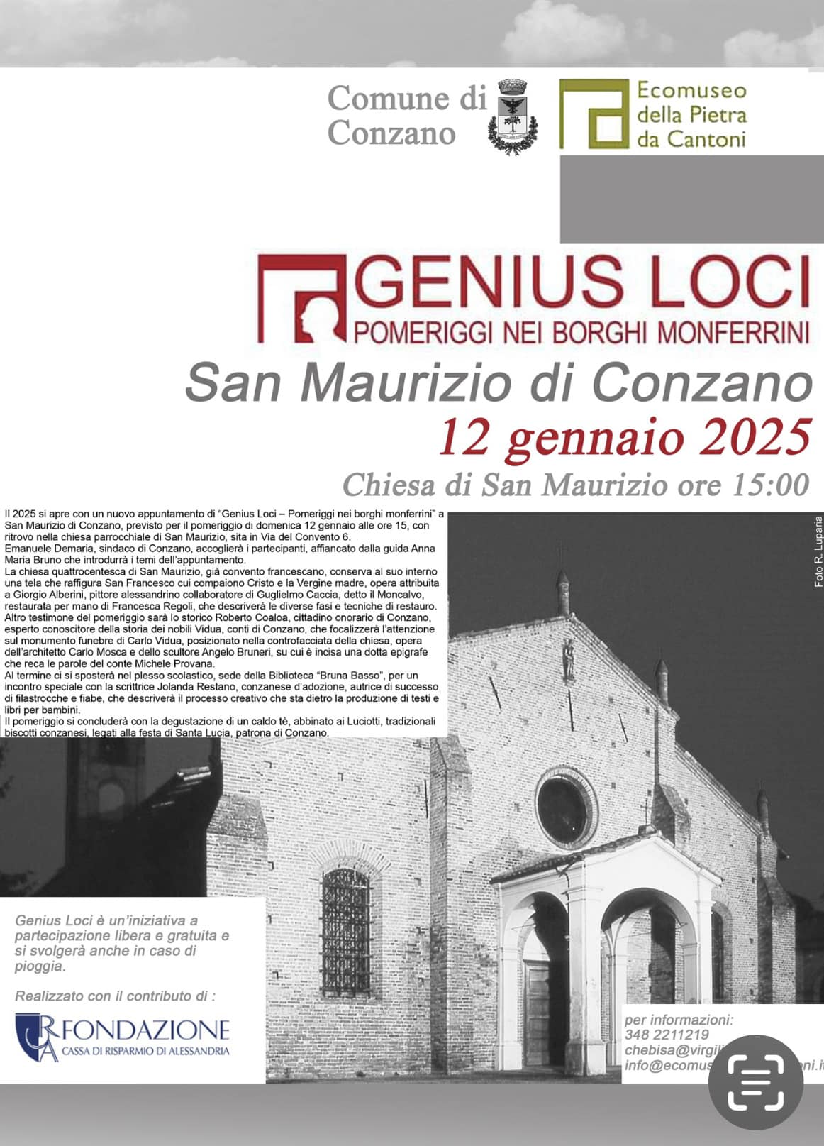 A CONZANO prosegue domenica alle 15,00 la rassegna "Genius Loci- Pomeriggi nei Borghi Monferrini" ( ritrovo chiesa di San Maurizio ); per maggiori informazioni clicca qui