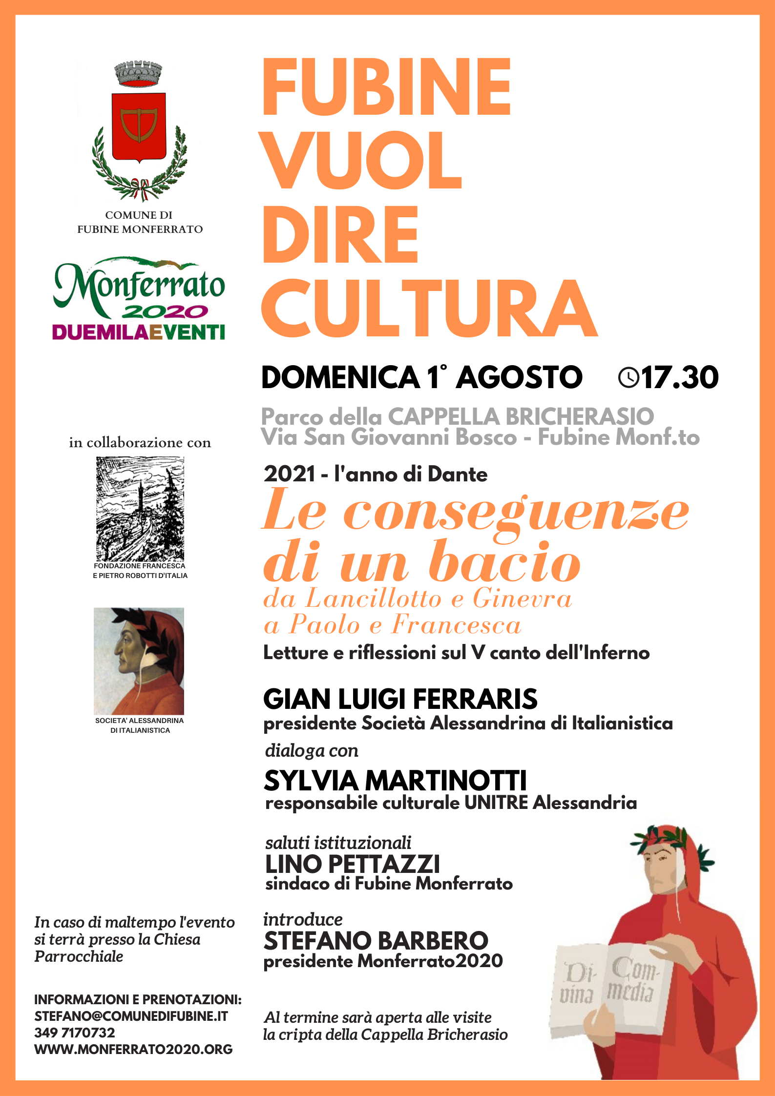 A FUBINE MONFERRATO nell'ambito della Festa Patronale è in programma la conferenza "Le conseguenze di un bacio - Da Lancillotto e Ginevra a Paolo e Francesca", in occasione del 700esimo anniversario della morte del Sommo Poeta; appuntamento nel parco della Cappella Bricherasio domenica alle 17.30; al termine si potrà visitare la cripta bistolfiana; è raccomandata la prenotazione; per maggiori informazioni potete cliccare qui.