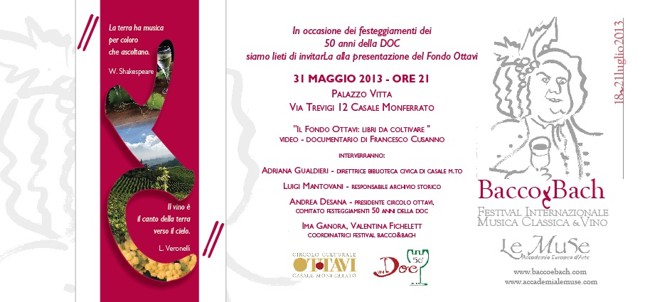 Interverranno Adriana Gauldieri, direttrice della Biblioteca Civica di Casale Monferrato, Luigi Mantovani, responsabile dell’Archivio Storico, Andrea Desana, presidente dei circolo Ottavi e del comitato per i festeggiamenti del Cinquantenario della Doc, Ima Ganora e Valentina Fichelett, coordinatrici del festival Bacco&Bach.