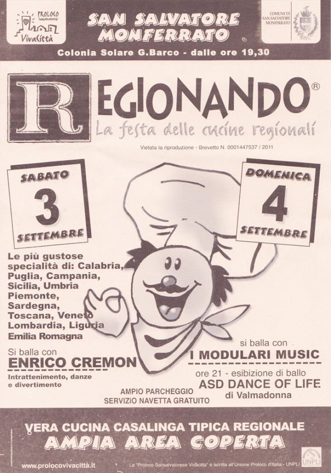 Un finesettimana all'insegna della cucina casalinga tipica regionale a San Salvatore: il 3 e 4 settembre la festa delle cucine regionali porterà in Monferrato le più gustose specialità di Calabria, Puglia, Campania, Sicilia, Umbria, Piemonte, Sardegna, Toscana, Veneto, Lombardia, Liguria ed Emilia Romagna.
