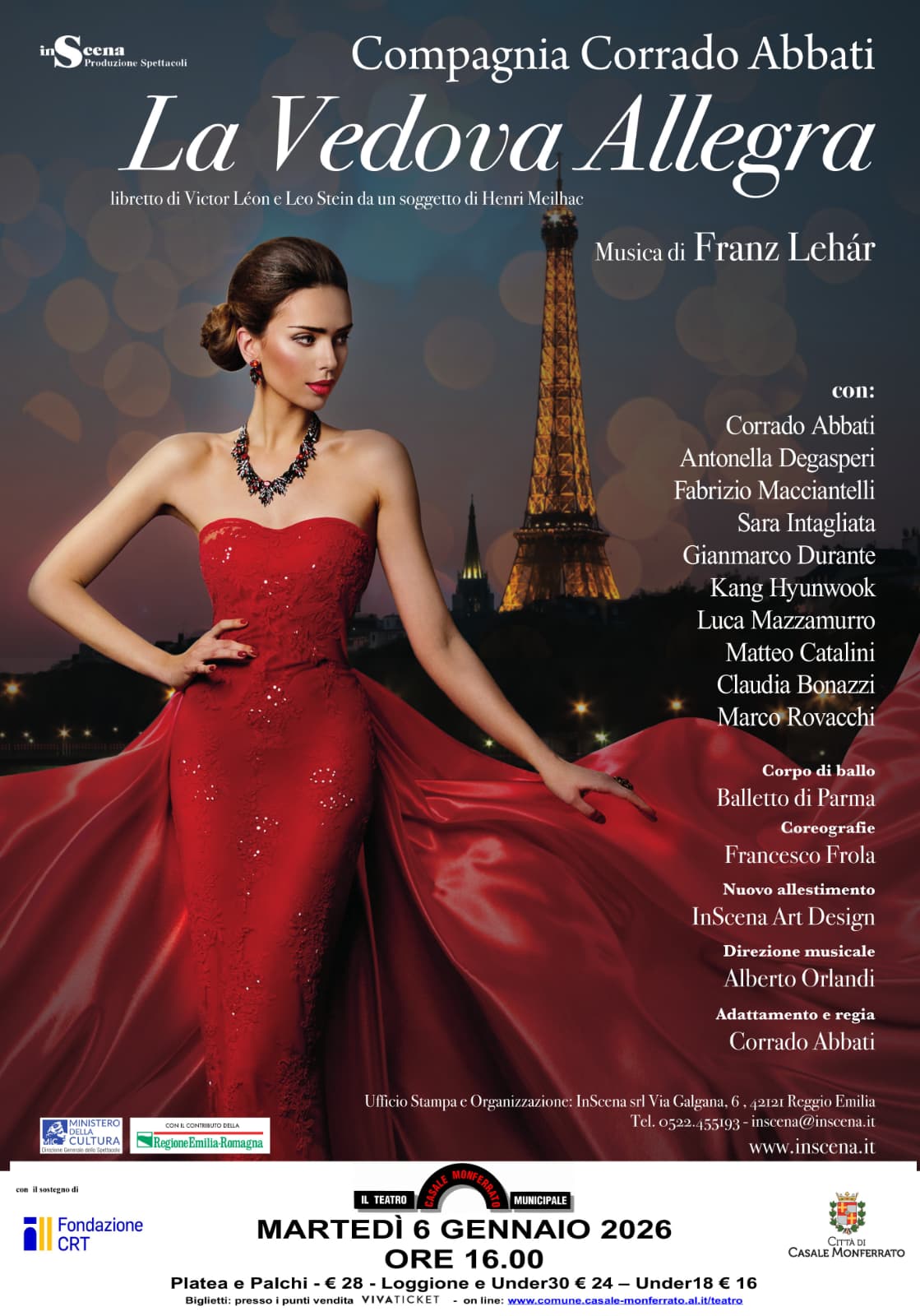 L’operetta “La Vedova Allegra” è in programma martedì 6 gennaio 2026 alle ore 16,00: ispirata al concetto di “leggerezza” di Calvino, questa edizione de La Vedova Allegra propone un allestimento fedele allo spirito dell’operetta, con musica di Franz Lehár, coreografie di Francesco Frola, regia e adattamento di Corrado Abbati, direzione musicale di Alberto Orlandi e il Balletto di Parma, privilegiando ritmo, eleganza e interazione con il pubblico.