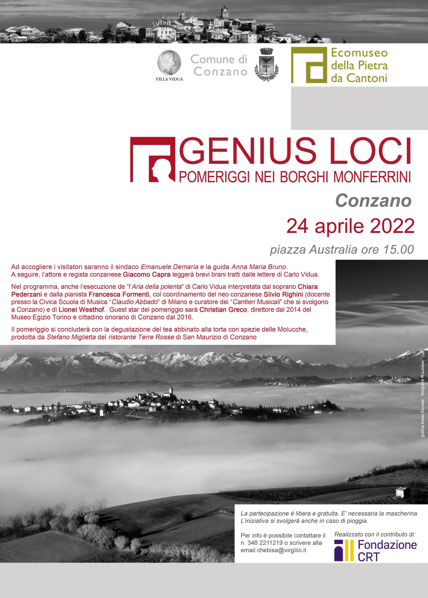 Prosegue DOMENICA 24 aprile “Genius Loci, Pomeriggi nei Borghi Monferrini” , la narrazione dello spirito di un luogo custodito nel patrimonio culturale di una terra, attraverso percorsi culturali, con visita degli angoli più suggestivi della storia e dei suoi personaggi, con una nuova tappa a CONZANO.