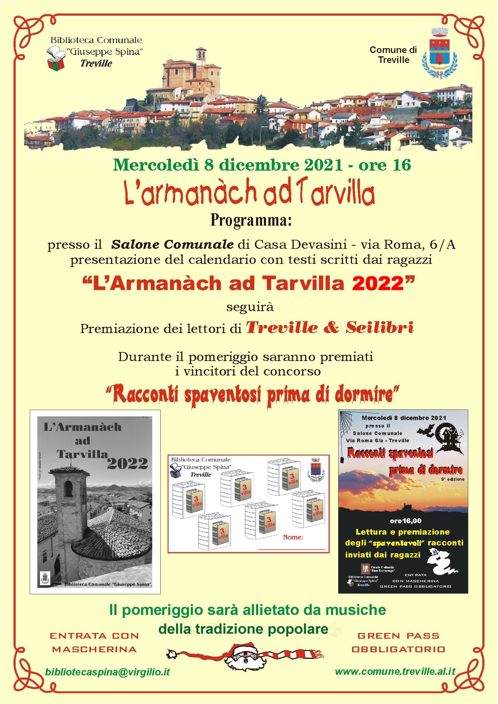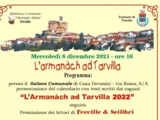 calendario “L’Armanàch ad Tarvilla 2022”. L’occasione, che tradizionalmente è a ridosso del Santo Patrono di Treville Sant’Ambrogio, torna ad essere pubblica (obbligo green pass dai 12 anni e per tutti uso della mascherina) e si terrà nel Salone Comunale di Casa Devasini (via Roma 6/A) a Treville (adiacente i locali della biblioteca) alla presenza del