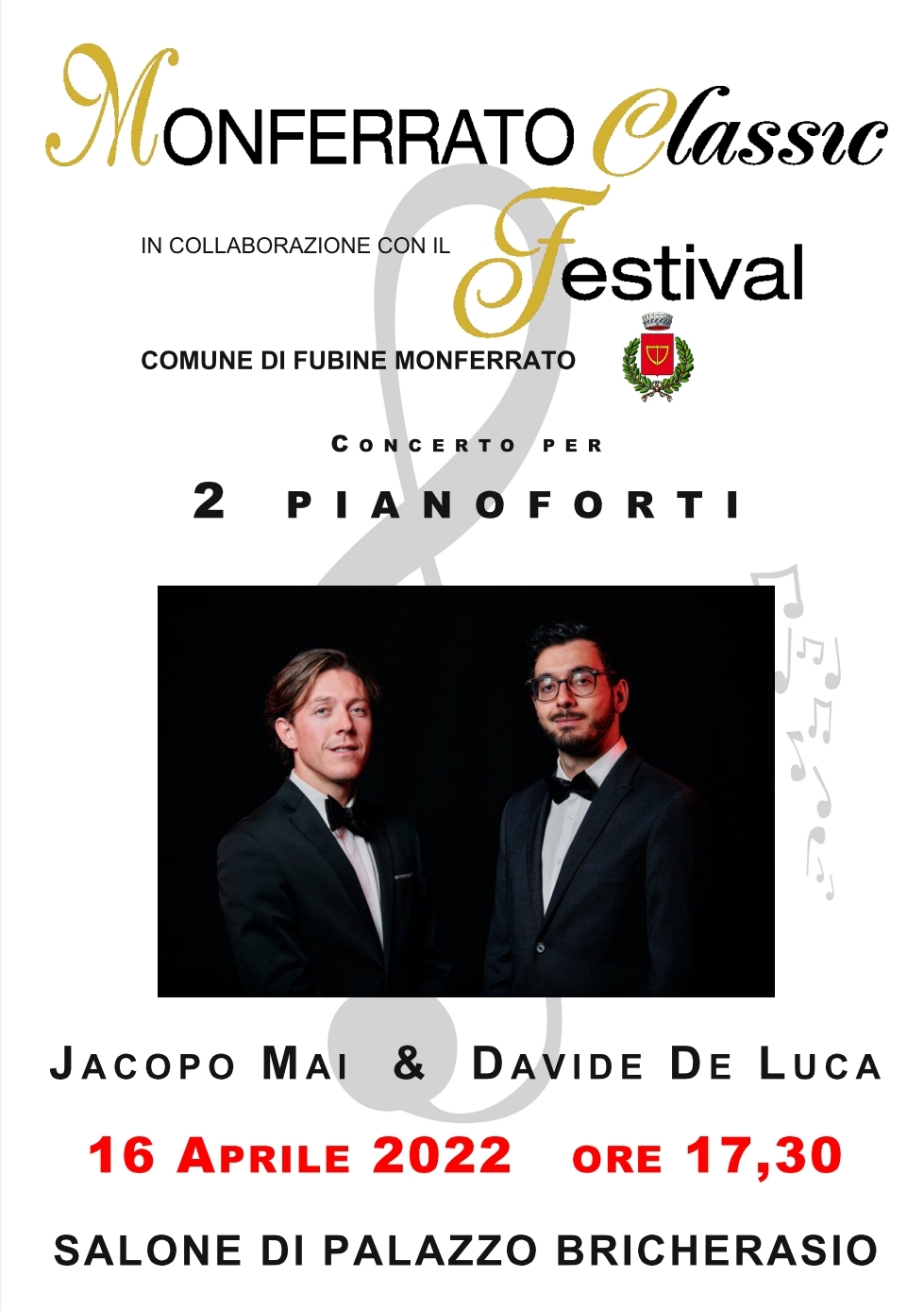 Sabato 16 aprile a Fubine, presso lo storico salone di Palazzo Bricherasio, in collaborazione con il Comune di Fubine, si svolgerà il terzo appuntamento del MCF. In programma la " Dante Sinfonia" per 2 pianoforti di Franz Liszt, di raro ascolto considerata la estrema difficoltà non solo tecnica ma anche e soprattutto interpretativa. Nel secolo scorso, Liszt non è stato solo un grande virtuoso della tastiera ma ha lasciato un profondo solco storico e culturale. Animato da una vibrante vocazione a creare continue coesioni fra letteratura, pittura e musica diviene un profeta insostituibile del suo tempo e,di conseguenza, anche del nostro grazie alla ricca eredità che ci ha lasciato.