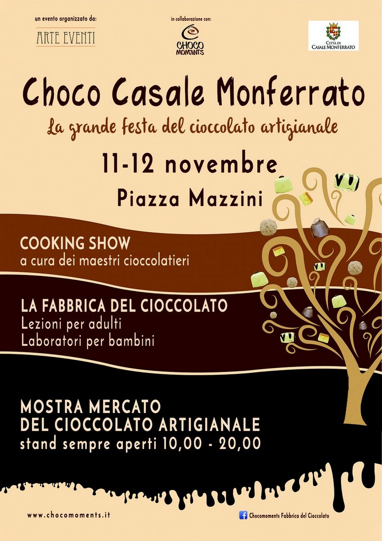L’arte dei migliori maestri cioccolatieri d’Italia arriva a Casale Monferrato in provincia di Alessandria. Sabato 11 e domenica 12 novembre in Piazza Mazzini ci sarà la prima edizione di “Chocomoments Casale Monferrato“ la festa del cioccolato artigianale organizzata da Chocomoments e Arte Eventi con il patrocinio del Comune. Un’occasione unica per scoprire tutta la bontà del “cibo degli dei” attraverso cooking show, laboratori per bambini e lezioni di cioccolato per adulti. Sono infatti queste le straordinarie attrazioni della Fabbrica del Cioccolato, la grande struttura che mostra in presa diretta tutte le fasi di lavorazione del cioccolato con il percorso di conoscenza Choco Word Educational. Per gli appassionati di cioccolato c’è la grande mostra mercato con stand sempre aperti dalle 10.00 alle 20.00 dove è possibile scoprire il ricco assortimento di gustose praline, tavolette al latte, fondenti e aromatizzate, creme spalmabili, liquori al cioccolato, le deliziose sacher e le intramontabili fragole con panna e cioccolato caldo. Inoltre per gli amanti del “cibo degli dei” ci sono anche le sculture di cioccolato e tante piccole raffinate creazioni tutte da gustare. Presso la fabbrica del del cioccolato tanti gustosi eventi nell’evento a cominciare dai cooking show in programma domenica alle 15,00 "Come nasce una sacher” e alle 18.00 “Come nasce una pralina?” realizzata con un ingrediente a sorpresa un prodotto tipico della città. Per i più piccoli c’è lo spazio Choco Baby aperto tutti i giorni dalle 15.30 alle 17.30 nel quale è possibile improvvisare con il cioccolato, per realizzare deliziosi cioccolatini con tutte le attrezzature necessarie: grembiuli, cappellini, guanti e attrezzi per la lavorazione (costo € 5.00). Domenica, infine, dalle 10.00 alle 12.00 gli adulti potranno imparare a fare i cioccolatini partecipando al mini-corsi di pralineria a cura dai maestri cioccolatieri Chocomoments (costo € 30.00 a persona prenotazione obbligatoria giancarlo.maestrone@gmail.com). Info su www.chocomoments.it U