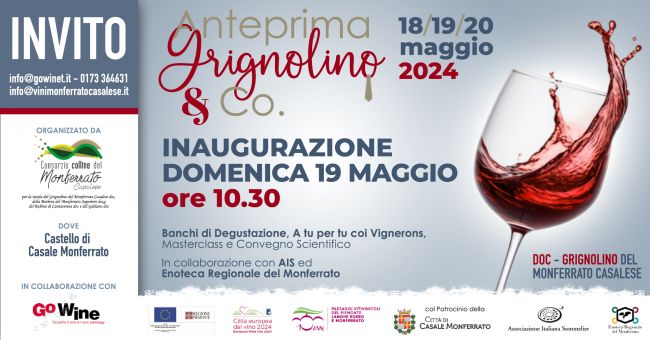 E’ tutto pronto per la 2° Edizione di Anteprima Grignolino & Co, il tributo al vino autoctono più identificativo del Monferrato casalese, ricco di storia e virtù che, dal 18 al 20 maggio prossimo, tornerà a palesarsi nelle sue diverse sfumature e peculiarità, tra le mura dell’antico Castello paleologo a Casale Monferrato.